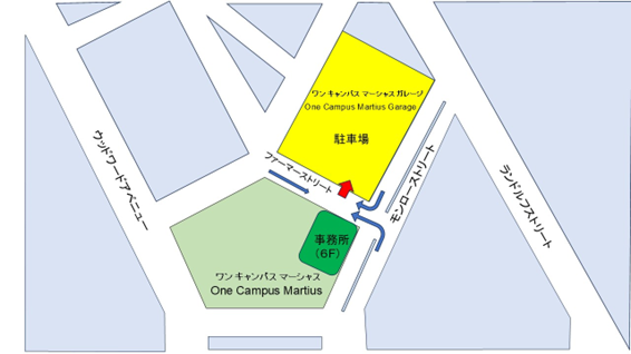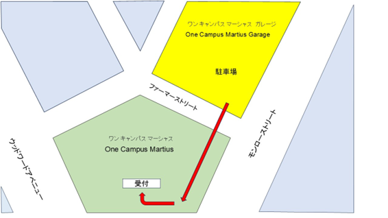 1 One Campus Martius Garage1階出口からOne Campus Martiusに向かっていただき、1階正面の受付にて入館証を受領してください。
